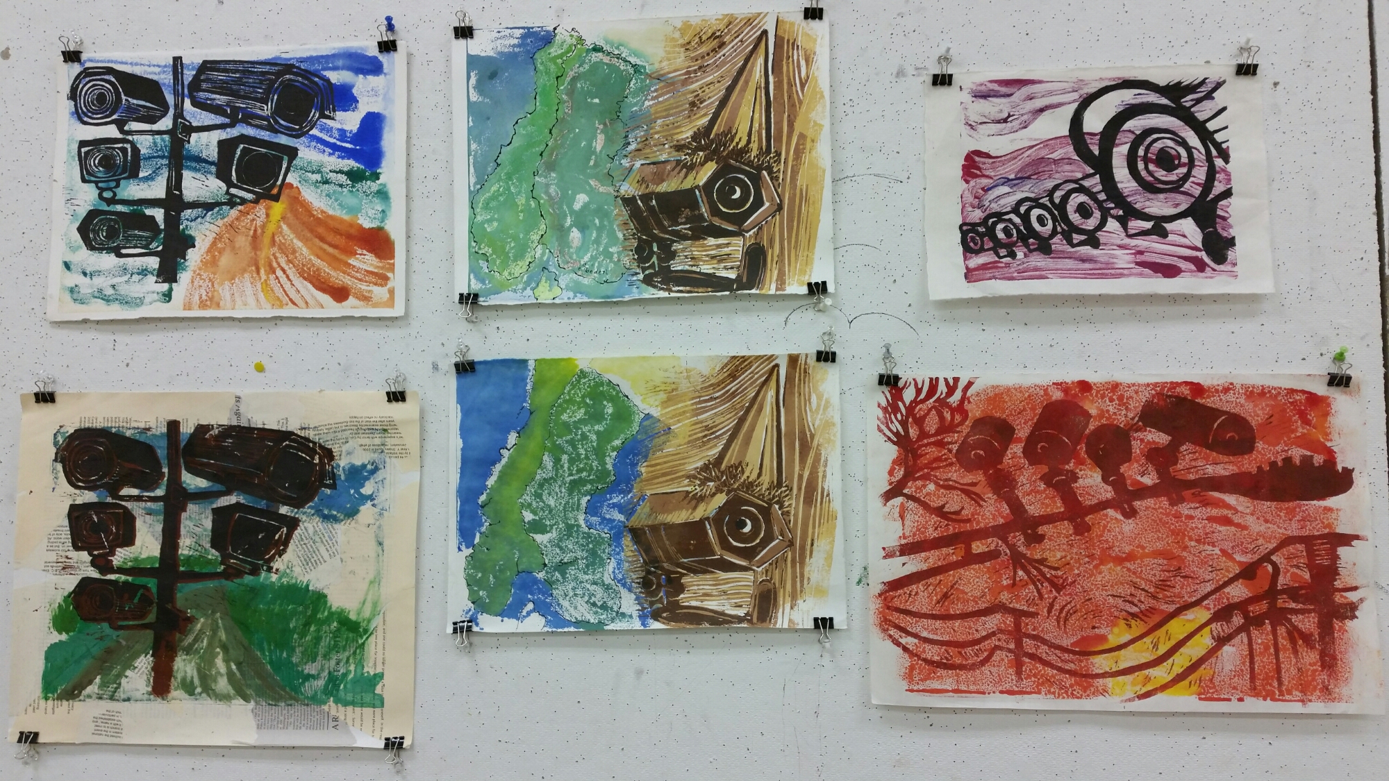 I have been working on the theme of surveillance and cameras using relief prints and monoprints.